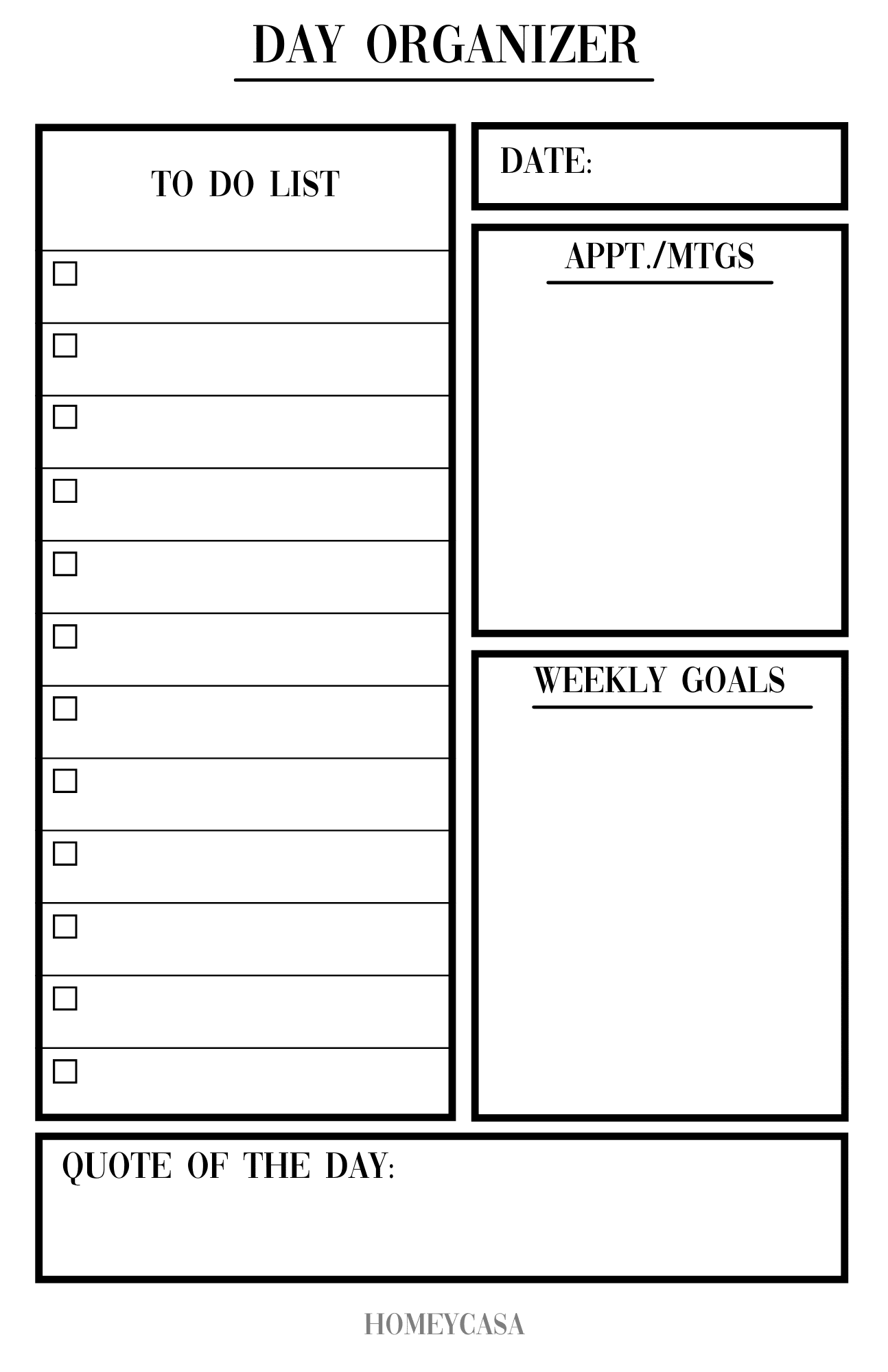 Homeycasa created a day organizer to help you stay organized! If you have been wanting to be more organized, this is the perfect way to start your organization journey. Download this free printable to start! Don't forget to tag @homeycasa on Instagram and Facebook to be featured on our stories!